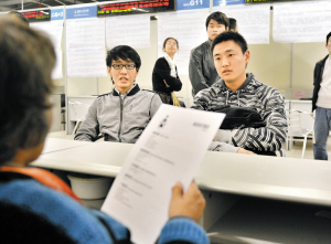 昨日,北京亮马河大厦,负责海外建设的国有企业招聘摊位前聚集了许多等待应聘的留学生。