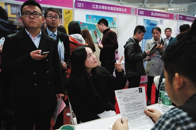 昨日,北京亮马河大厦,负责海外建设的国有企业招聘摊位前聚集了许多等待应聘的留学生。 当日,由教育部留学服务中心举办的2016春季留学英才